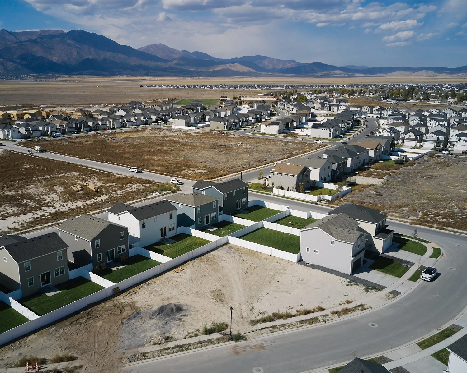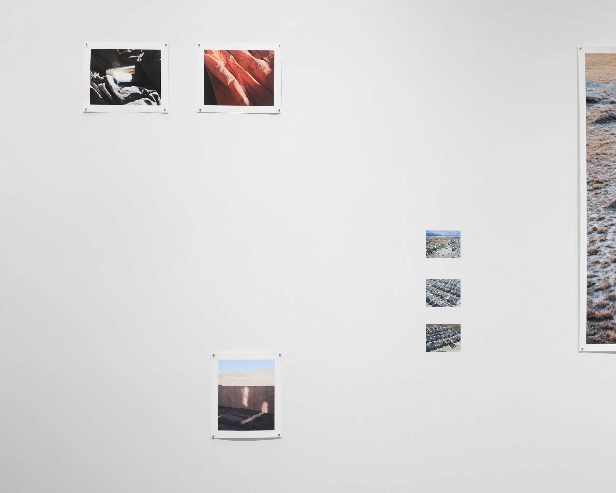 flux investigates the transformation of the American West through suburban sprawl and its markers of control and division. Aerial views of uniform suburban developments juxtapose intimate, ground-level images of construction materials, fences, and landscapes. The arrangement encourages viewers to question the narratives of progress embedded within these rapidly expanding suburban landscapes. This work consists of seven pigment prints on polyester fabric and cotton rag paper, with print sizes including 4x5 inches, 8x10 inches, and 40x50 inches.
